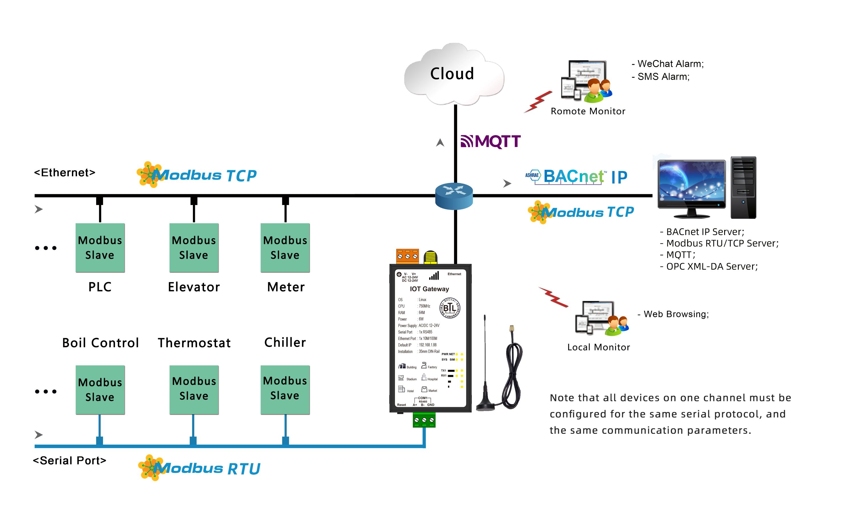 IoT gateway is applied in building automation systems or industrial fields to connect Modbus RTU devices. It resolves the issue of integrating non-BACnet devices with building control configuration software such as Johnson Controls' Metasys, Honeywell's EBI or Niagara, Siemens' Insight or Desigo CC, and Schneider's EBO. Additionally, it addresses the integration of serial Modbus RTU devices, such as PLC, DDC, thermostat, elevator, HVAC system, UPS, fire Alarm, smart lighting, electricity meter, water meter, etc., with configuration software like Citect, IFIX, RSVIEW, WinCC, Kingview, and ForceControl via the Modbus TCP protocol over Ethernet.