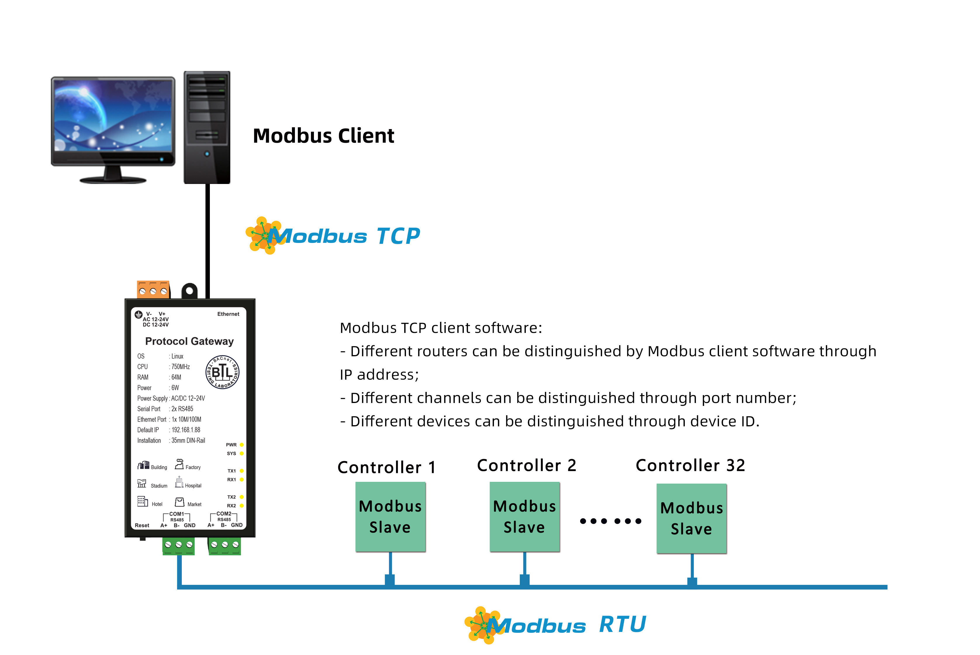 Support for converting a single Modbus RTU bus to an Ethernet port with Modbus TCP protocol.