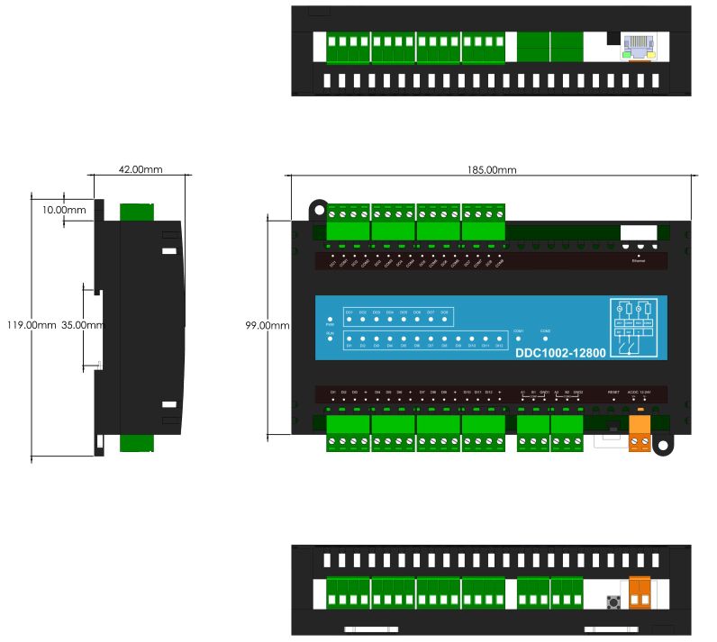 DDC1002-12800 (1 Ethernet, 2 serial port, 12 DI, 8 DO, dynamically supports 512 points) only supports collecting Modbus RTU/TCP and Simulator driver, and convert it to BACnet IP and Modbus TCP servers simultaneously. Using X2View software to make the project(can¡¯t make configuration pages). User can configure the project according to the communication protocol document of on-site Modbus RTU/TCP device , and convert it to a standard BACnet IP and Modbus TCP server. After monitoring successfully on the local monitor mode, upload the project file to DDC module to access the data of on-site device (Note: The decimal address of the collection end starts from 1 (Base1), and the hexadecimal address starts from 0 (Base0); The Modbus register base address of the transfer end starts from 1 (Base1).