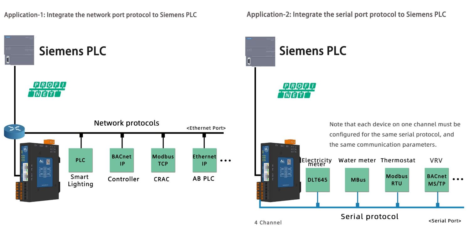 The hardware gateway PFN1024-ARM supports multiple protocol conversions, acting as a communication bridge that converts other non-standard communication protocols into the Siemens Profinet standard communication protocol. This enables Siemens S7-200, S7-300, S7-400, S7-1200, S7-1500 and other PLCs to communicate with different devices from third parties through the gateway.