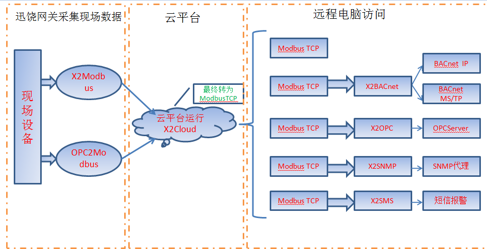 通过迅饶X2WebOPC2Web网关采集现场数据,然后把数据上传到云端平台,在云平台上运行迅饶X2Cloud转为Modbus TCP协议。这样远程客户端通过访问云端Modbus TCP就可以访问到现场设备实时数据。如果客户端需要通过BACnetOPCSNMP等监控现场数据,也可用上迅饶其他网关产品。