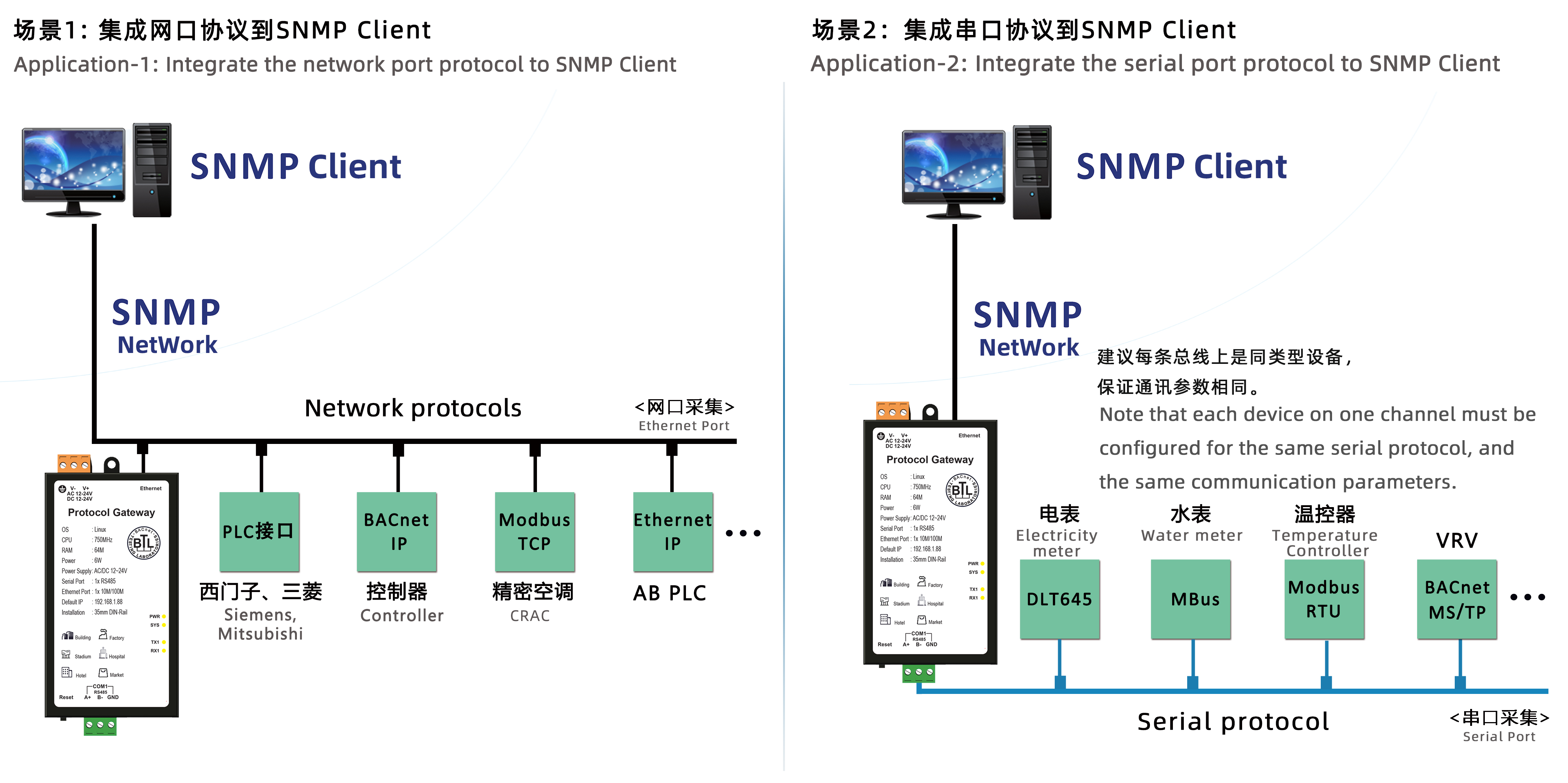 现场的设备连接SNMP硬件网关,网关采集数据向外提供SNMP代理接口,SNMP客户端就可以通过访问SNMP接口对现场设备进行管理监控。
