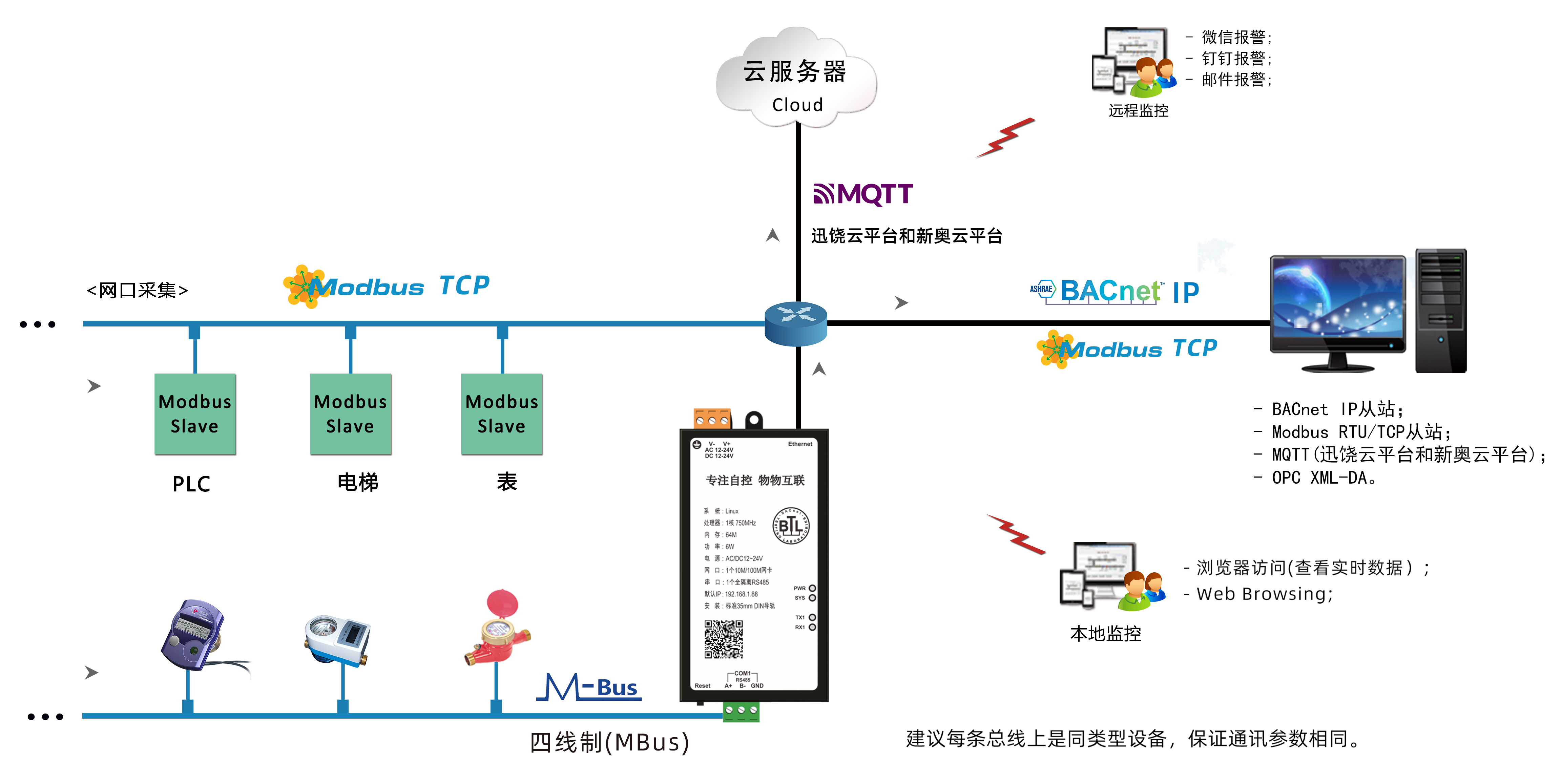 迅饶MBus物联网关HMI1001-MBus,有1个网口、1个RS485串口),可以集成四线制MBus水表、能量表、热量表,DL/T645-1997/2007多功能电表或者Modbus协议的各种设备,同时也支持微信报警、钉钉报警、邮件报警,MQTT服务(支持迅饶云平台和新奥云平台)、工程上传云端等功能。