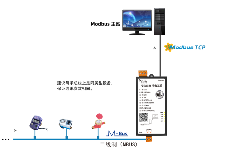 2、接两线制的MBus设备时,务必使用24V电源供电。