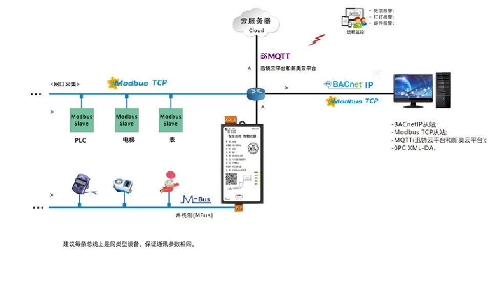 迅饶MBus物联网关HMI1010-MBus,有1个网口、1个MBus口),可以集成两线制MBus水表、能量表、热量表或者Modbus协议的各种设备,同时也支持微信报警、钉钉报警、邮件报警,MQTT服务(支持迅饶云平台和新奥云平台)、工程上传云端等功能。